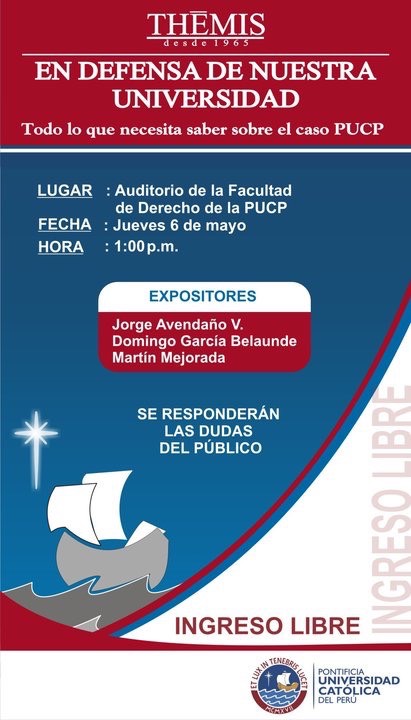 Banner del seminario organizado por la Asociación Jurídica Themis sobre el conflicto legal con el Arzobispado de Lima llamado “En defensa de nuestra universidad”. Los expositores fueron el doctor Jorge Avendaño Valdez, el doctor Domingo García Belaunde y el doctor Martín Mejorada Chauca, todos ellos profesores principales del Departamento de Derecho.