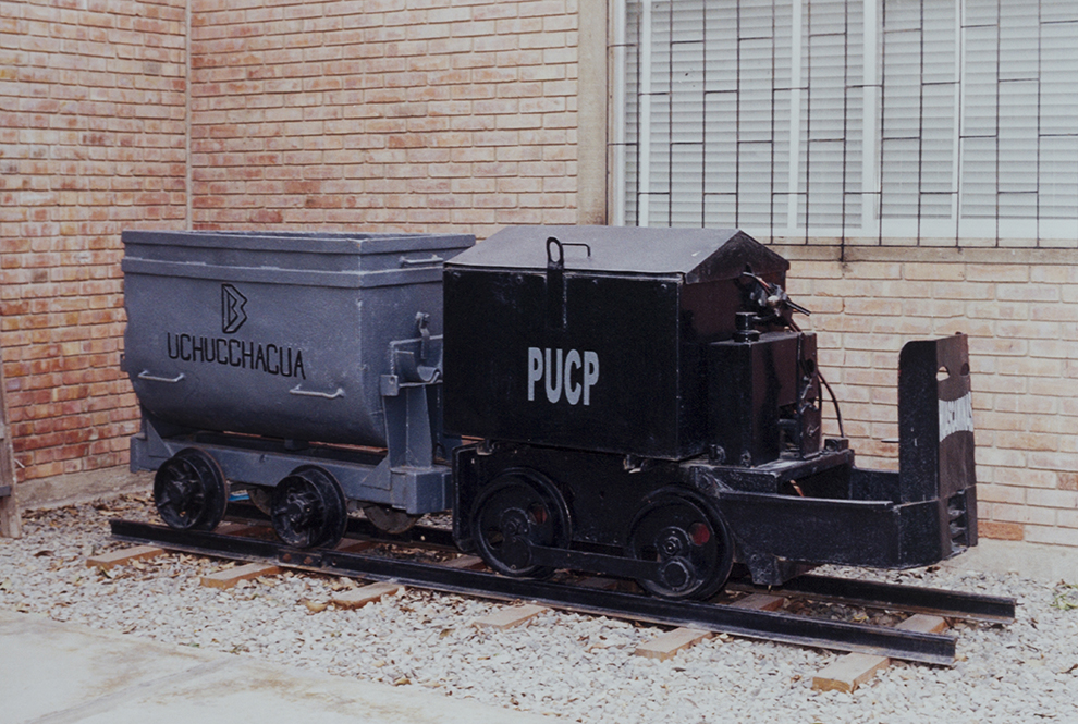 Pequeña locomotora accionada a batería (siglas PUCP), que traslada un vagón de mineral que lleva la inscripción “B” de Buenaventura y Uchucchacua, por la mina de plata que Minas Buenaventura explota en la localidad del mismo nombre, en la provincia de Oyón, Dpto. de Lima