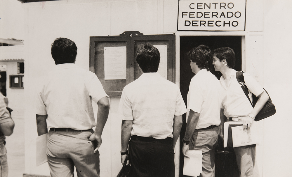 Fachada del local del Centro Federado de estudiantes de la facultad de Derecho, CF, durante su inauguración. El objetivo del CF de Derecho es representar los intereses de los estudiantes y ser un puente entre ellos y sus autoridades. La creación del Centro Federado se dio durante el segundo decanato del doctor Jorge Avendaño Valdez.
