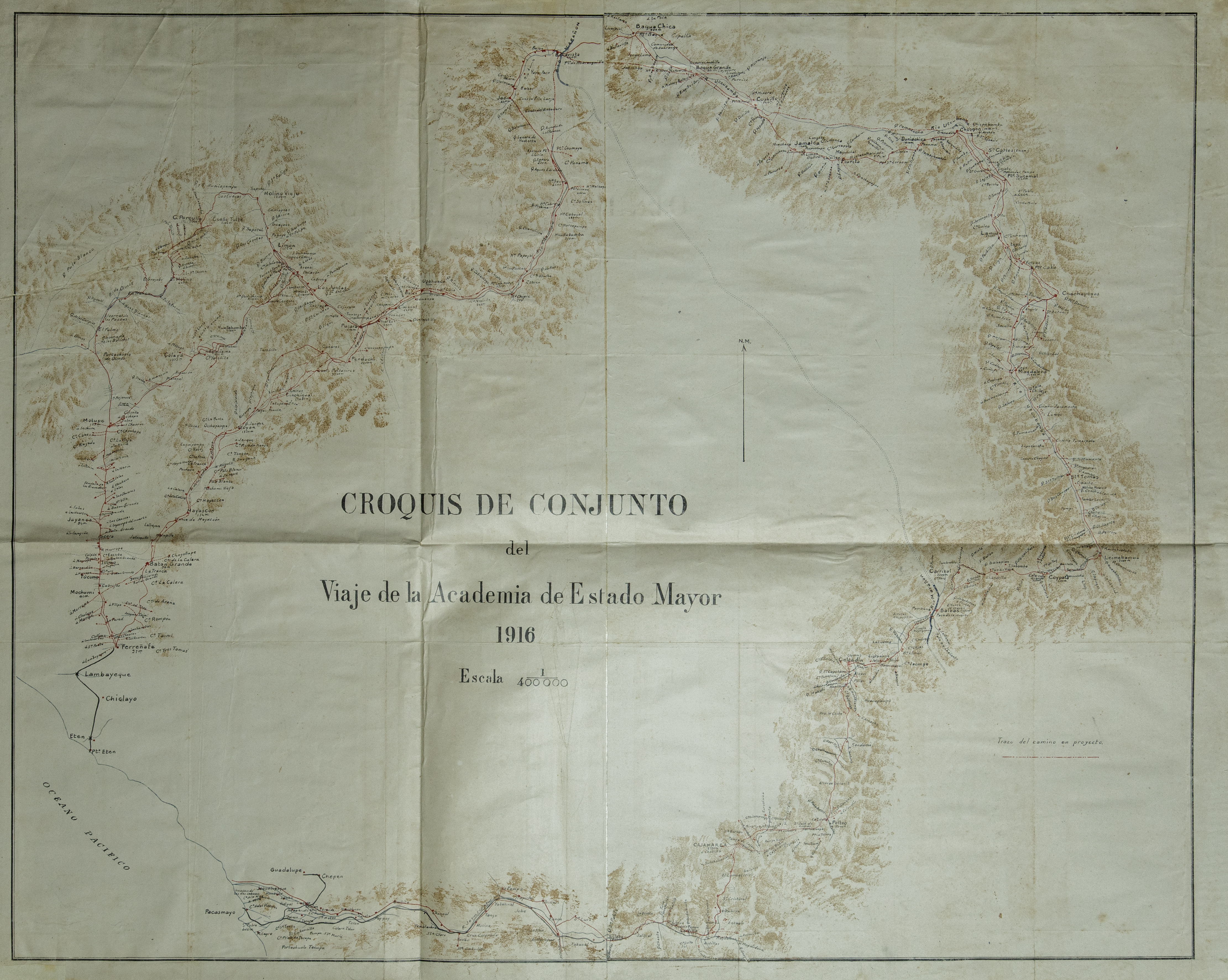 Mapa físico que muestra la ruta del viaje realizado por la Academia de Estado Mayor a través del norte del país durante el año 1916. El mapa muestra algunos valles y quebradas identificados por la expedición, cuyo viaje incluyó los departamentos de Lambayeque, Piura, Cajamarca, Amazonas y La Libertad. La expedición estuvo dirigida por el militar peruano Isaac Zapater Bravo.