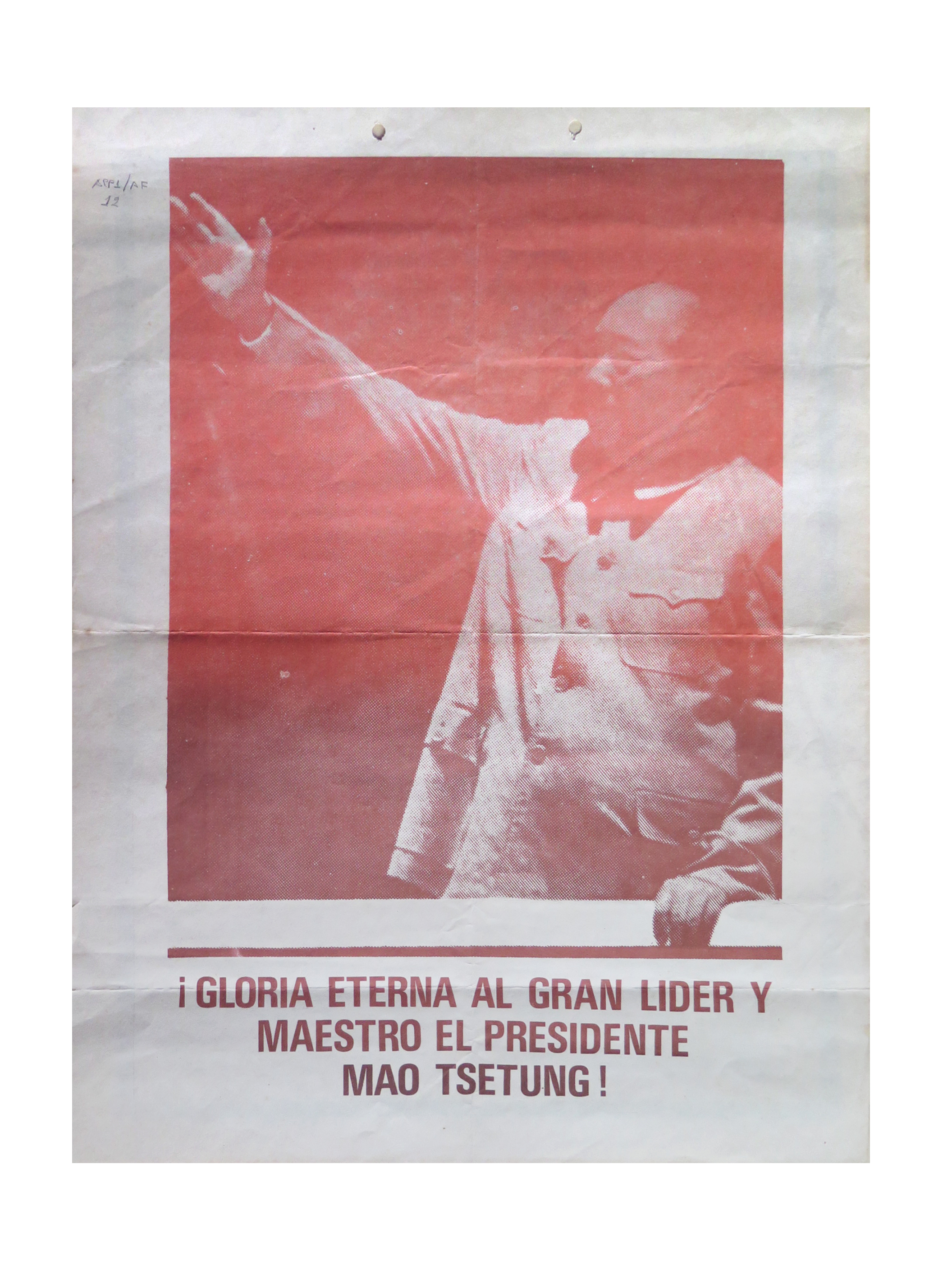 Al reverso: Comunicado de la Central de Cooperativas de los trabajadores en la educación del Perú. Al anverso: Volante dando gloria a Mao, Zedong.