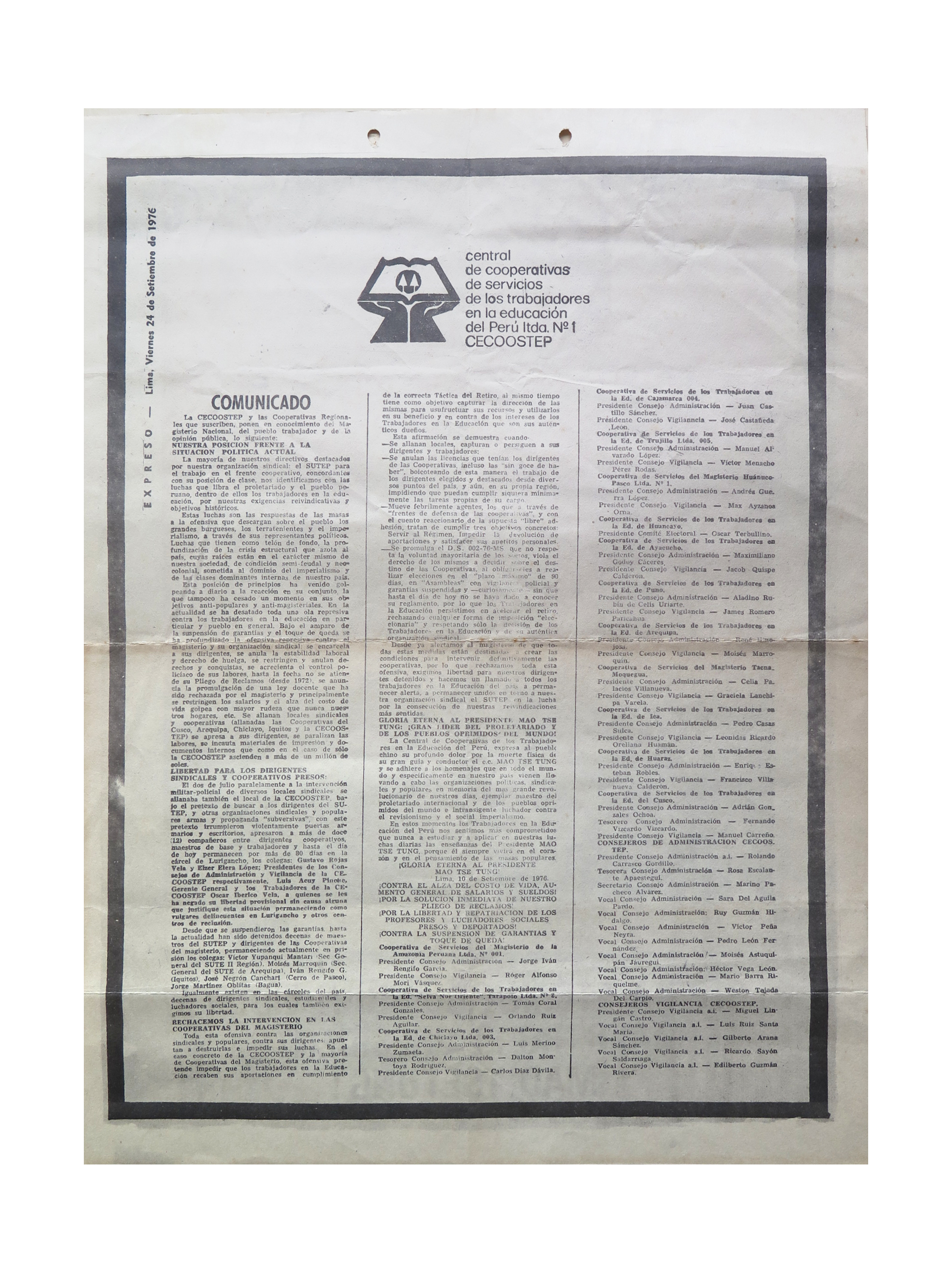 Al reverso: Comunicado de la Central de Cooperativas de los trabajadores en la educación del Perú