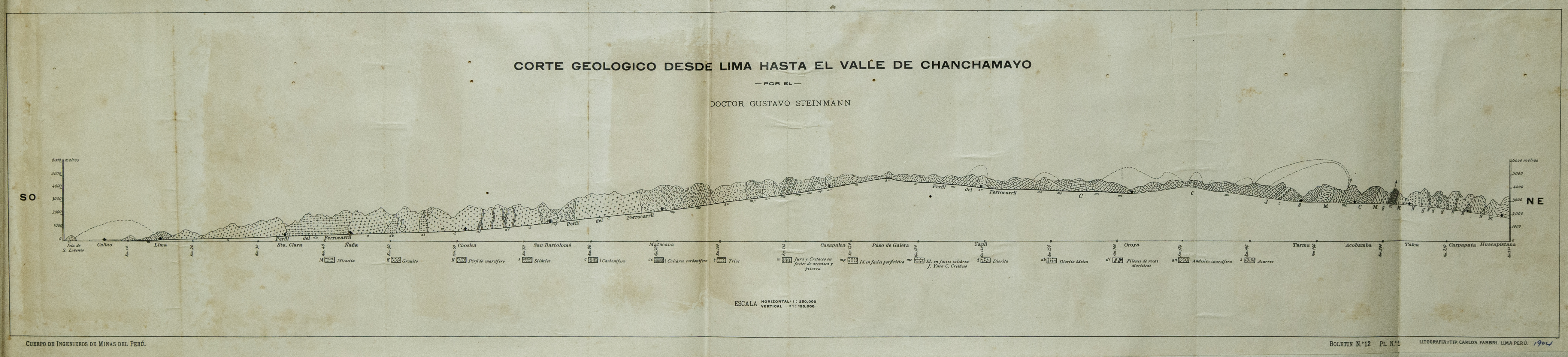 Mapa geológico, elaborado por el geólogo alemán Gustav Steinmann, que identifica los tipos de rocas existentes entre Lima y Chanchamayo, pertenecientes a los departamentos de Lima y Junín respectivamente.