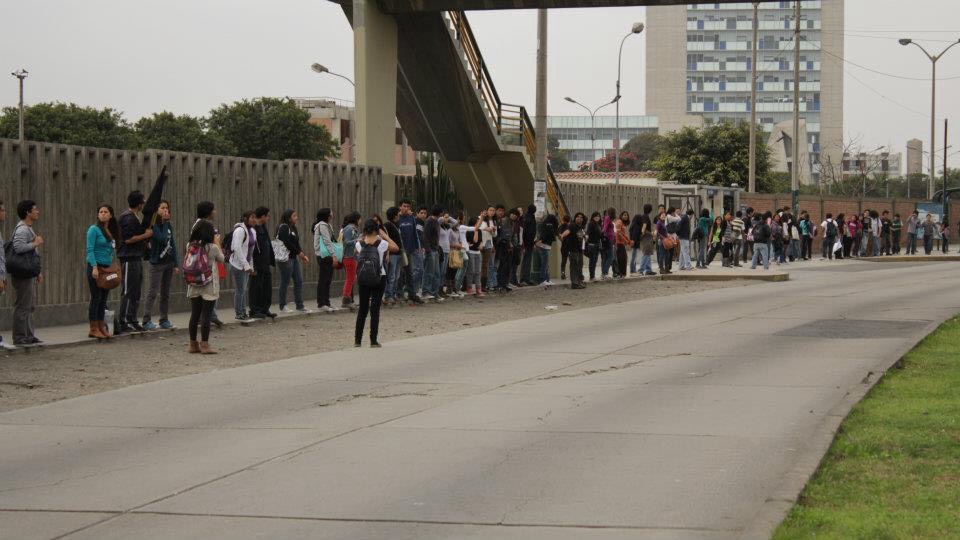 Cadena humana realizada por los estudiantes en el exterior del campus universitario en protesta por los nuevos estatutos que solicitó santa sede. En ese momento las autoridades de la universidad participaban de una asamblea en la que evaluaban la situación. La protesta reunió a más de 2500 personas y contó con la participación del doctor Henry Pease García y el rector Marcial Rubio Correa, entre otras autoridades.