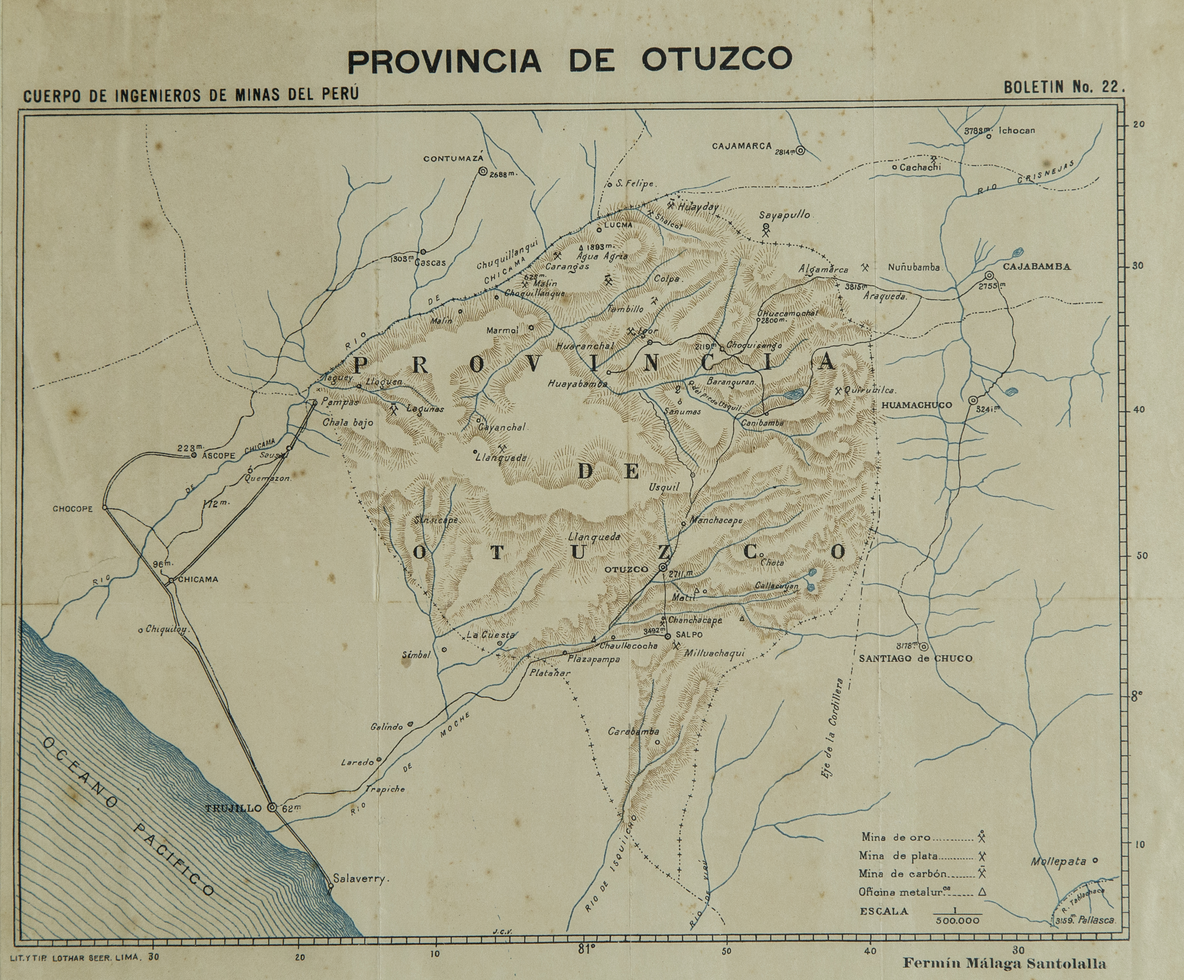 | dc.description.abstract | Mapa económico de la provincia de Otuzco, perteneciente al departamento de La Libertad, elaborado por el ingeniero peruano Fermín Málaga Santolalla. El mapa fue originalmente publicado en el número 22 del Boletín del Cuerpo de Ingenieros de Minas del Perú, correspondiente al año 1905. El mapa fue elaborado en la Litografía y Tipografía Lothar Seer. | es_ES |