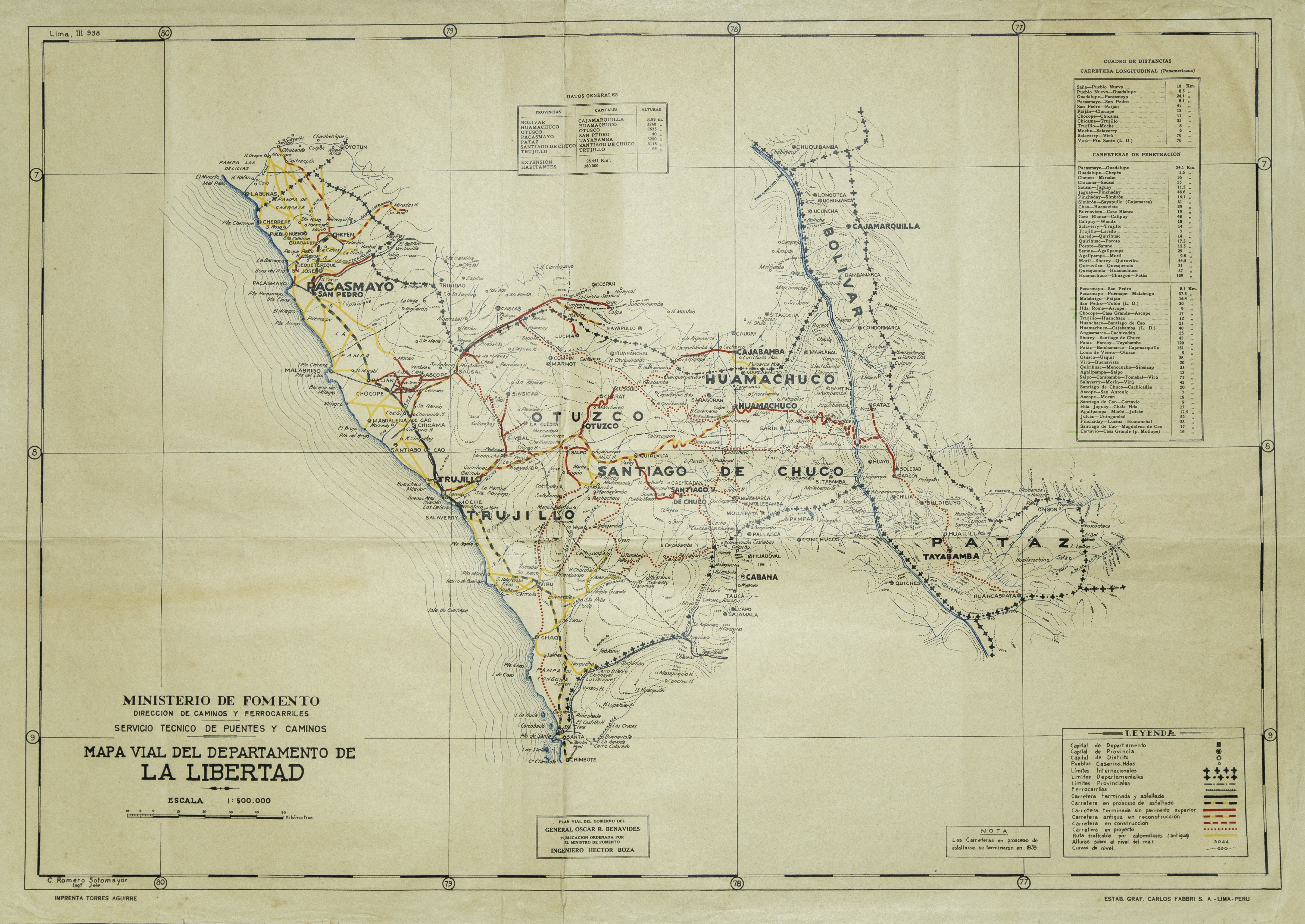 | dc.description.abstract | Mapa vial del departamento de La Libertad elaborado por el ingeniero Carlos Romero Sotomayor. Se trata de un mapa que corresponde al plan vial del gobierno del General Oscar R. Benavides y cuya publicación fue ordenada por el ingeniero Héctor Boza, Ministro de Fomento. El mapa muestra carreteras de penetración y la carretera longitudinal o Panamericana, distinguiendo carreteras antiguas en reconstrucción, en construcción, en proyecto, terminadas y asfaltadas, en proceso de asfaltado y terminadas sin pavimento superior. El mapa contiene cuadros de datos generales (provincias, capitales, extensión y total de habitantes) y de distancias entre lugares. El mapa fue elaborado en la Imprenta Torres Aguirre y en la Litografía y Tipografía Carlos Fabbri. | es_ES |