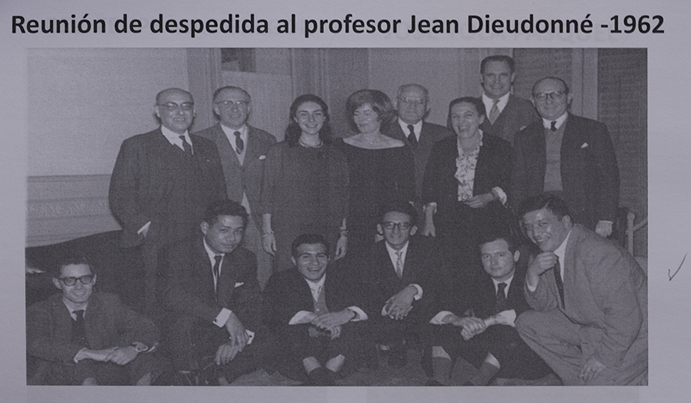 De pie, de izquierda a derecha: Alberto Gonzales, Luis Santaló, Cora Sadosky, Hilda de Santaló, Alexander Ostrowsky, Cora de Sadosky, Jean Dieudonné y Manuel Sadosky. Sentados, los becarios sudamericanos: Marcos Sebastiani, Roberto Velásquez, José Benza, César Carranza, Horacio Feliciángeli y Alonso Viteri.