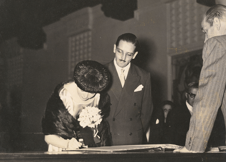 Matrimonio civil de Luis Jaime Cisneros Vizquerra, profesor de Estudios Generales Letras, y Sarah Hamann, profesora de Historia, realizado en la Municipalidad de Miraflores.