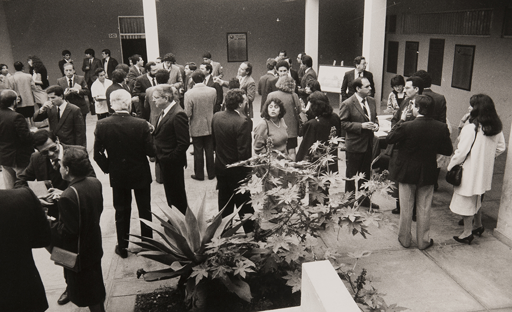 Profesores y autoridades de la universidad socializan durante la ceremonia de inauguración del pabellón de la facultad de Derecho.